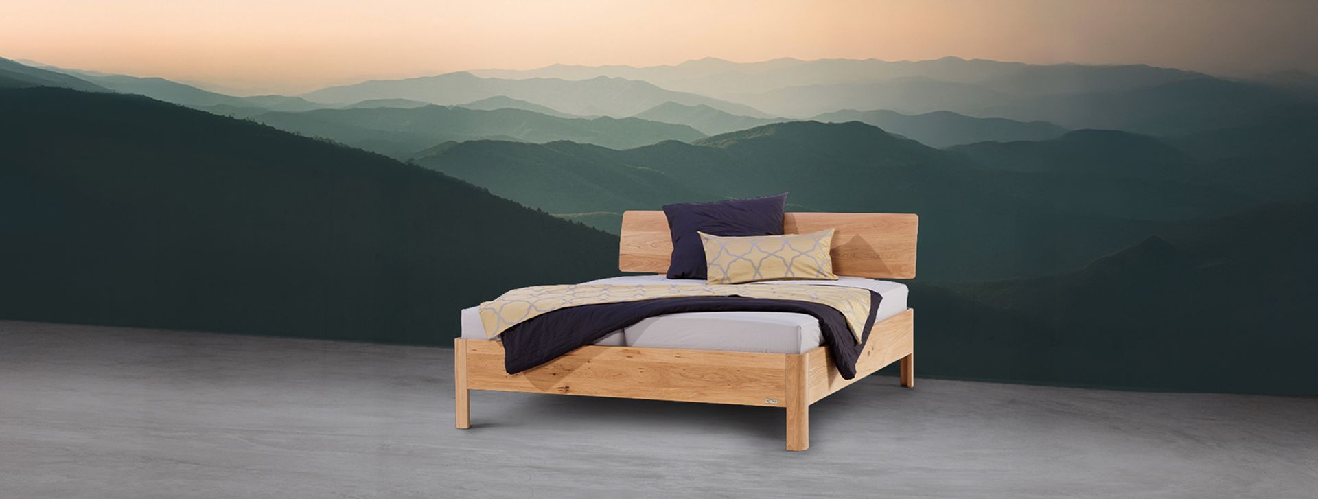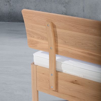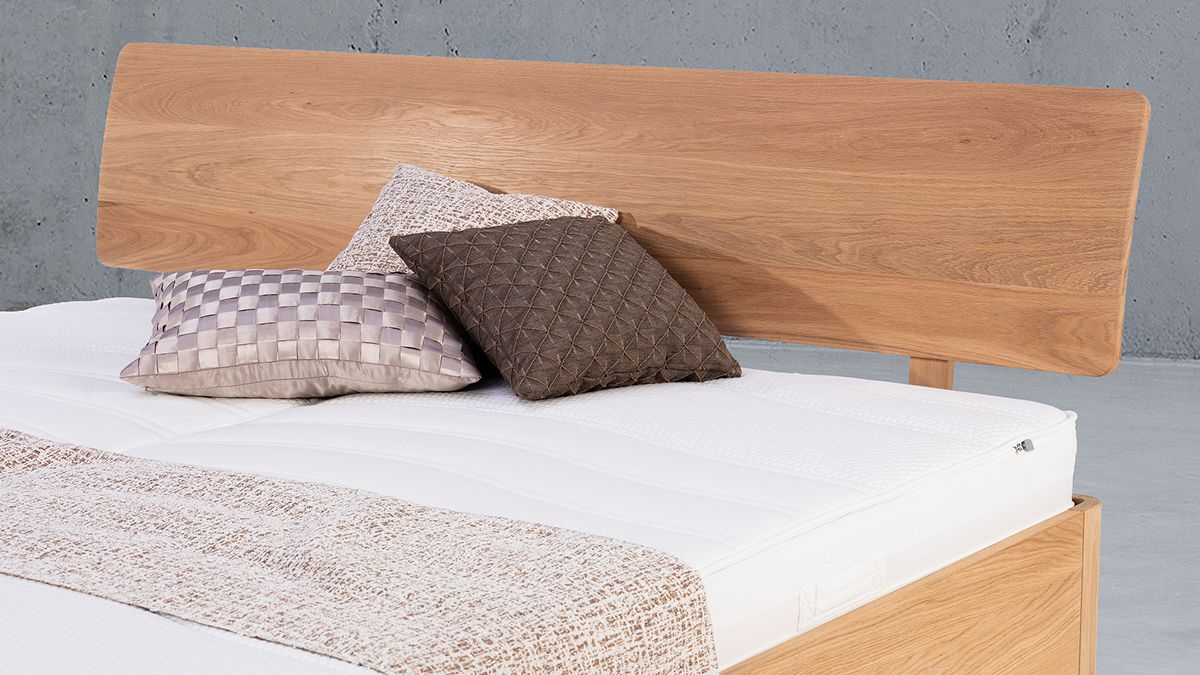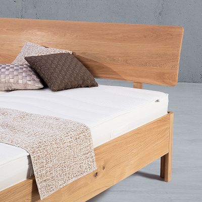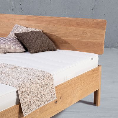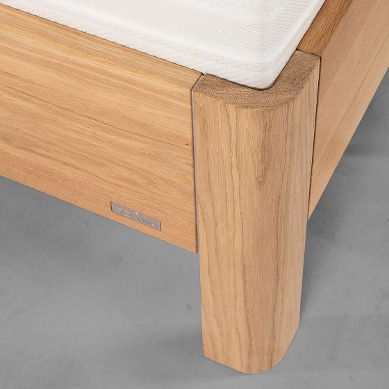 Stabverleimte Eiche, harmonisch abgerundete Füße, klare Linienführung. EMAHO 25 bringt Formgefühl ins Schlafzimmer.